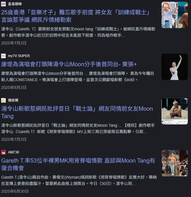 不過對於湯令山今年的新聞,我卻是不能不眉頭一皺。湯和另一位新世代歌手Moon Tang本來是情侶,兩人識於微時,一樣有音樂才華。在湯令山以前在商場表演的時候,我也有親眼看過Moon Tang到場支持,二人在外界看起來很般配,說郎才女貌可能太超過,但我想也算金童玉女吧。
